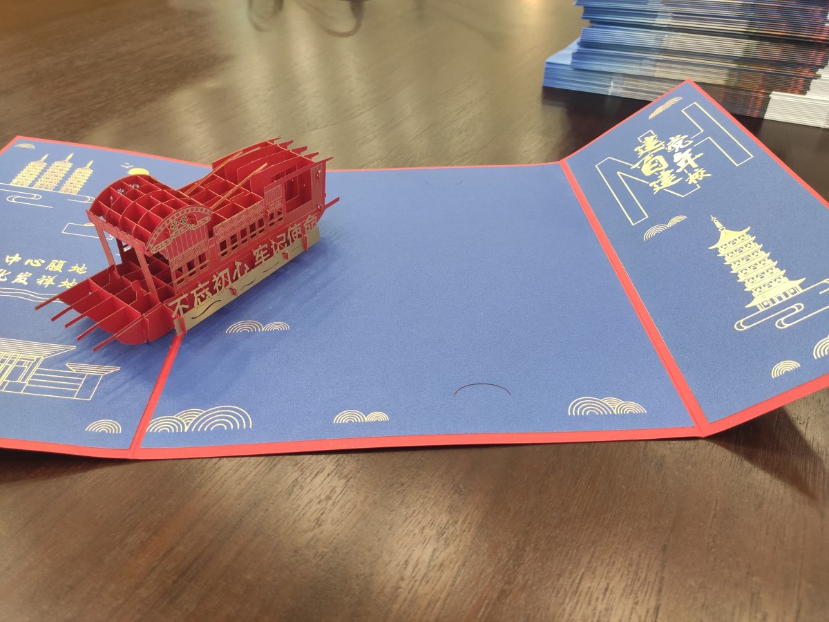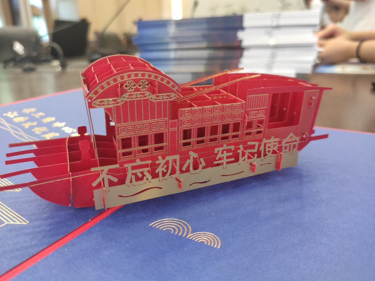 随着红色的三折页缓缓打开,党的百年征程跃然纸上。嘉兴红船的模型精致地印在录取通知书上,三塔、壕股塔、南湖革命纪念馆、江南水乡等元素也有所呈现。
